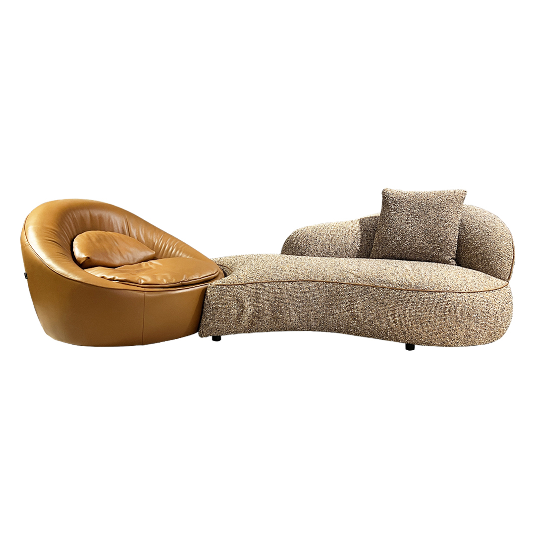 圓弧轉椅可靈活旋轉,搭配編織質感的柔曲貴妃座,可自由選配不同面料與顏色,展現多材質的對話與風格碰撞。